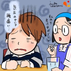 2025年4月13日 / 最終更新日時 : 2025年4月13日 珈琲順太 今日の珈琲イラスト 2025年04月13日 今日のイラスト 気圧の変化で頭痛 ずずーん。。 なんだか頭が重たくて痛いです。 特に思い当たることもないのに、そんな時は。 気圧による頭痛の可能性が高そうです。 う〜ん、痛い。。。 頭痛薬を飲んでちょっとでも軽減しましょう! お大事にし […]